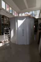 Sakraali kaupunki -projektiin ideoitujen kolmiulotteisten esineiden ja reijitettyjen pintojen projisointitestausta ja tutkimista.